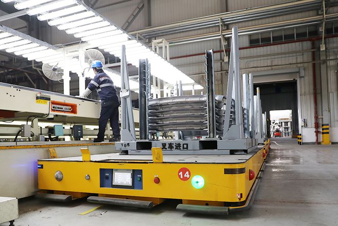 鋼板完成所有沖壓工序之后,都會經(jīng)過人工檢查,如果有問題會交到返修部門。配合檢測的還有平行光檢測室,檢測頻率是50件/次,檢測合格的產(chǎn)品會由AGV小車運(yùn)往倉庫。這種小車在其他車間同樣能夠見到,是個(gè)智能的自動運(yùn)輸設(shè)備。
